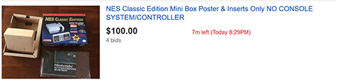 When the NES Classic Edition first came out, all units were scarfed up in seconds from every store. Many of them found their way onto eBay where they were sold for exorbitant amounts above their retail value. For example, this screenshot was taken from eBay in November 2016.