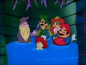 With the group trapped in the dungeon, Luigi is wondering if things could get any worse. Mario humors him by describing worse scenarios, such as the ceiling lowering onto them or water filling up the dungeon and drowning them. As luck would have it, these exact two things start happening, and they are all thrown into a panic. Just then, Mervyn appears in the dungeon with them! They barely have time to ask how he got there and instead beg him to use his magic to get them out before the ceiling and water do them in. Mervyn happily obliges, waves his wand, and all five of them are magically transported out of the dungeon. They end up in a scary forest called the Forest of Perpetual Night and Terrible Dangers. All of a sudden, in a lake nearby, a hand emerges from it, and it's holding a plumber snake. Mario asks Mervyn about it and Mervyn tells him that it is no ordinary plumber snake, but rather it is called Excalibur, and is a powerful and magical weapon. The hand from the lake throws it over to Mario, and when he catches it, he is transformed. Now, he is ready to take on King Koopa and take the throne away from him!