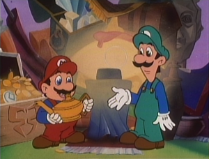 The Mario Bros. are having Lyle Alzado as a guest and they are preparing for his arrival when they get a phone call from their eccentric cousins Marianne and Luigeena. To their horror, they were also planning on dropping by, as well! So as Mario and Luigi are preparing for everyone's arrival and trying to figure out how they can prevent the three of their guests from meeting each other, they realize that they do not have the refreshment that they need so they leave to go shopping for it, promising to return quickly. At this moment, Lyle drops in and makes himself at home, wondering where everybody is. Just then, Marianne and Luigeena (played by Lou Albano and Danny Wells) arrive, as well! When they notice Lyle sitting on the couch, they immediately fall in love with him and start fawning over him, making Lyle very uncomfortable. Finally, Luigi and Mario return and pry their two crazy cousins away from Lyle. They then promise to leave, only after Marianne asks Lyle to go dancing with him later on, though. But when they see Mel Gibson on the street, they immediately forget about Lyle and hightail it out of there. At first, Lyle is relieved at this, but then realizes how much he wanted to go dancing and becomes sad. Mario and Luigi then try to cheer him up.Cartoon Segment