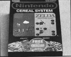 Inside this box are two bags of cereal, one side with a Mariotheme and the other with a Zelda theme. Some versions of thecereal contain prizes inside that include a miniature Zelda or Mario pinball game. You can also find game tips on theside of the box.