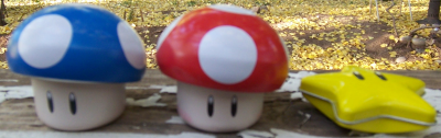 These containers are made out of tin and contain small, hard candies that taste very sweet and tangy. There is also a green 1-up mushroom container not shown here.