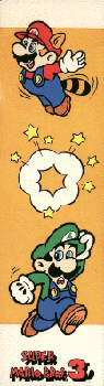 This is a bookmark depicting scenes from Super Mario Bros. 3. I got this from the book fair when I was in elementary school. Apparently, it was a gift type of bookmark because on the back it had "To" and "From" fields. |