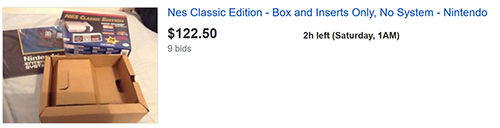 When the NES Classic Edition first came out, all units were scarfed up in seconds from every store. Many of them found their way onto eBay where they were sold for exorbitant amounts above their retail value. For example, this screenshot was taken from eBay in November 2016.