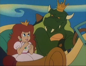 Mario, Luigi, Toad, and the Genie go after them immediately, first on foot, but realizing that they won't get very far that way, they buy a used magic carpet and take off on a high-speed air chase to rescue the princess. Their first attempt fails when Toad starts jumping around on the carpet to create a big dust cloud so that they aren't discovered, but when the Genie sneezes all of the dust away, they are caught like deer in headlights. Koopa then tosses Princess Toadstool into a pit of quicksand, and the Mario Bros. fly down to rescue her. Meanwhile, Koopa uses his carpet phone to call an army of Pidgits to come interfere. As soon as Luigi pulls the princess out of the quicksand and she is safe in their carpet, a bunch of Pidgits come flying in and start eating away at their carpet. In a panic, they are at a loss of what to do as their carpet begins shrinking away into nothing and. Then, Luigi suddenly remembers that he speaks the Pidgit language, so he grabs one of the Pidgits and orders it to go eat away at King Koopa's carpet instead. The Pidgit obeys and takes his army to Koopa and they all begin eating away at his carpet. King Koopa panics and while he's careening towards the ground as his carpet shrinks, he vows to get back at the Mario gang. All the Mario gang can do at this point is laugh at him.