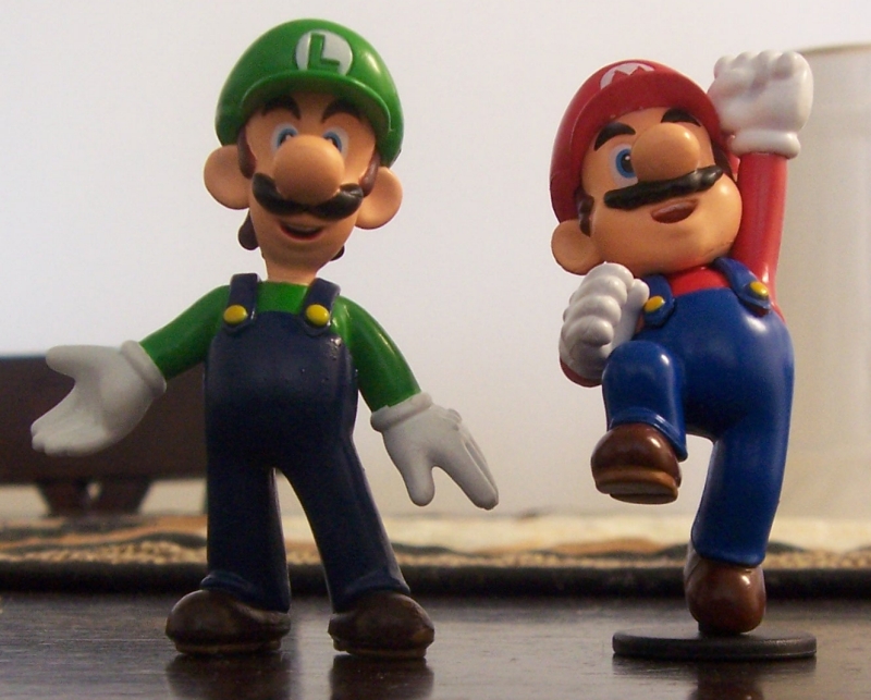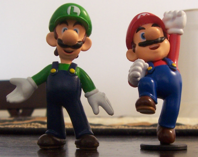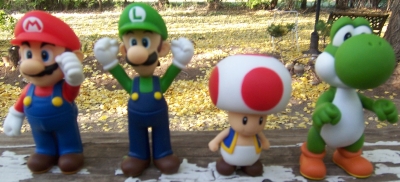 As a follow-up on the report from 2007 on these figurines, here are some that I have purchased! The first picture shows two Luigi and Mario figurines that are 2 centimeters (cm) tall, and the second shows Mario, Luigi, Toad, and Yoshi figurines that are 15 centimeters (cm) tall.