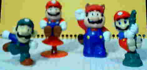 These little figurines came out in the late 80s/early 90s. The two Raccoon Marios at the top came with McDonald's Happy Meals. The Raccoon Mario on the right was the special "Under 3" version. The Luigi below was a cake decoration, and the Mario climbing a vine on the right below was bought at Sundial Cards & Gifts.