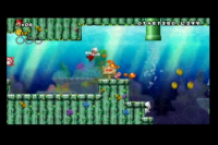 One of the new elements of this game is the multiplayer mode in which you can have up to four players play through the game simultaneously. Cooperate with your fellow players to get through a tough level. Veteran players can carry their less-skilled friends through a difficult section, jump on each other's heads to get a boost to that hard-to-reach Star Coin, and if someone's really in a bind, they can enclose themselves within a bubble and float around harmlessly.